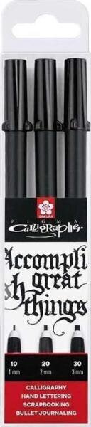 Ez egy automatizált szoftver általi fordítás:Kalligráfiai tollkészlet. A Pigma kalligráfiai készlet három fekete tollat ​​tartalmaz 0,1 mm, 0,2 mm és 0,3 mm hegymérettel. A kemény nejlon hegyűek ellenállnak a nagy nyomásnak és a gyakori használatnak, miközben megbízható és sima tintafolyást biztosítanak széltől szélig. A Pigma Calligrapher egy kényelmes, sokoldalú és tartós íróeszköz, amellyel precíz élek és finom vonalak hozhatók létre. A tollak ideálisak: kalligráfiához, kézíráshoz, scrapbookinghoz, képeslapkészítéshez, naplóíráshoz finom papírral.